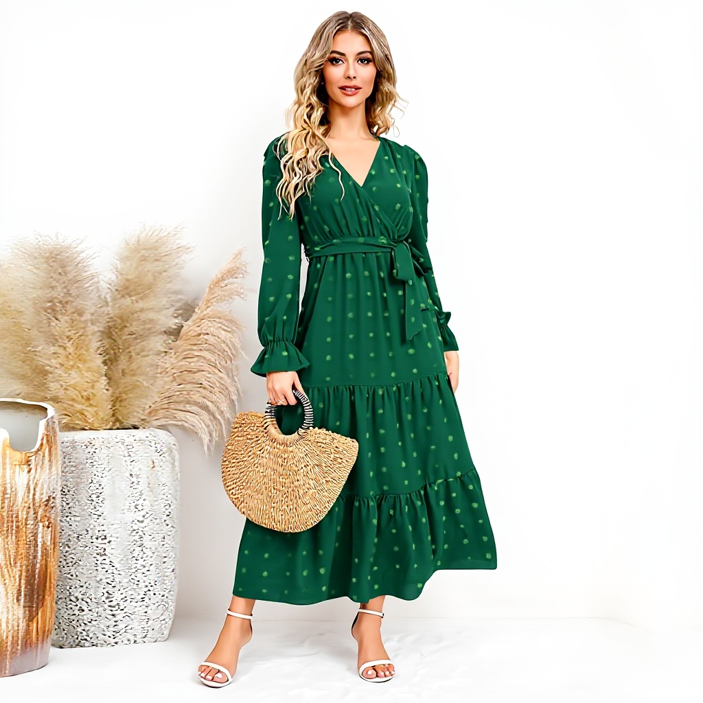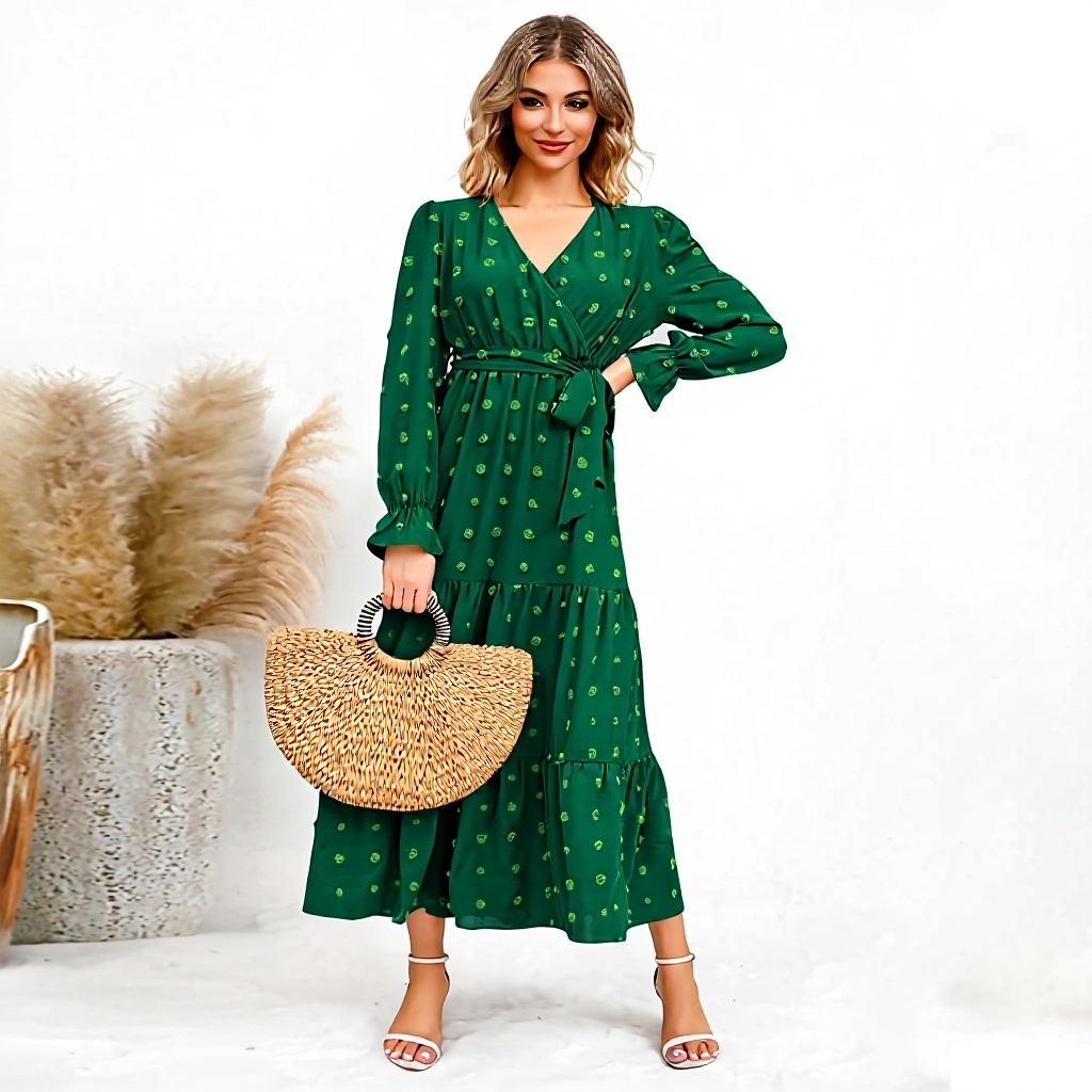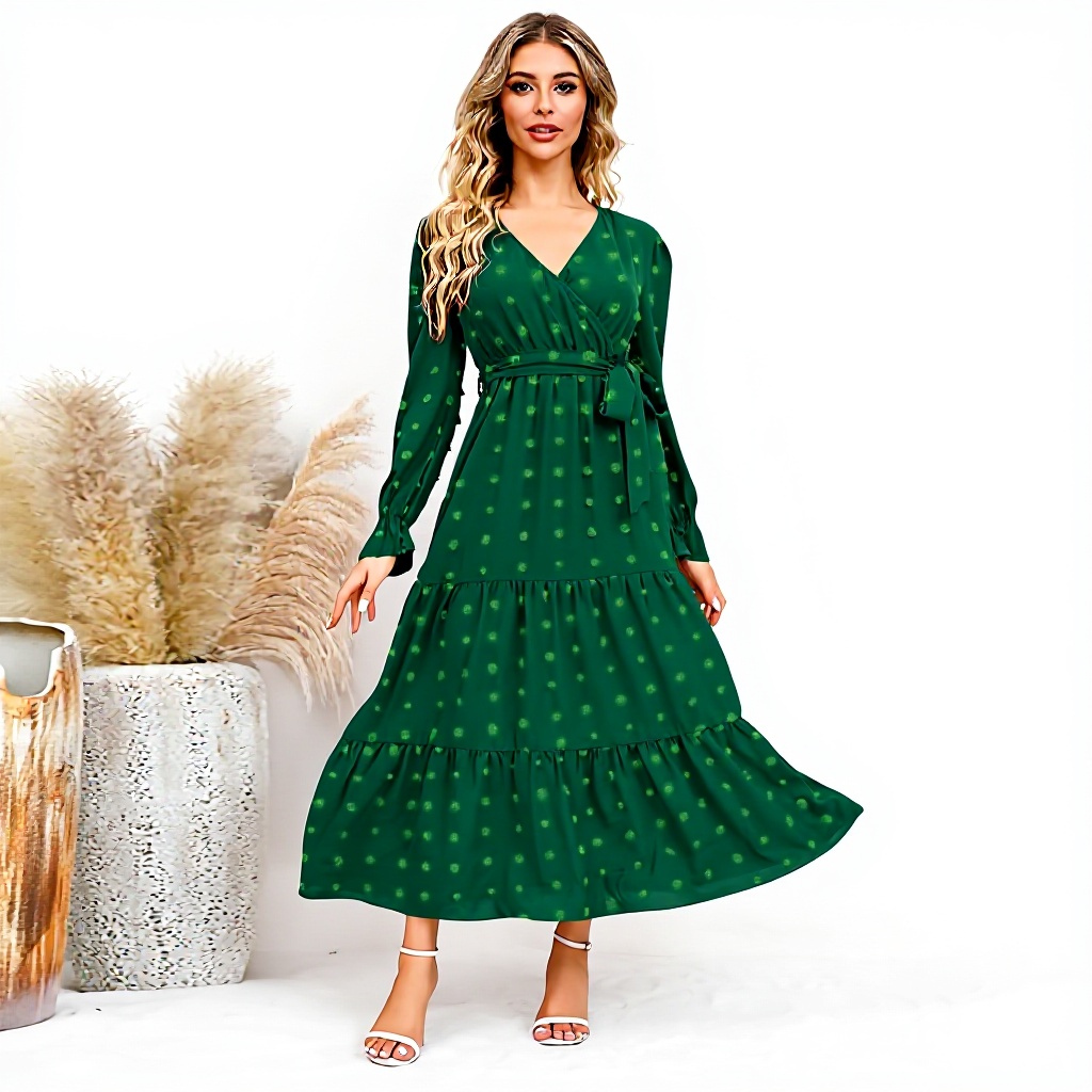 Questo abito da donna unisce eleganza e comfort grazie al suo design casual con maniche lunghe e scollo a V. La stampa a pois svizzero e i volant delicati creano un look sofisticato, mentre la linea ad A assicura una vestibilità comoda e avvolgente. Realizzato in tessuto di alta qualità, è morbido sulla pelle e mantiene la forma nel tempo senza restringimenti.