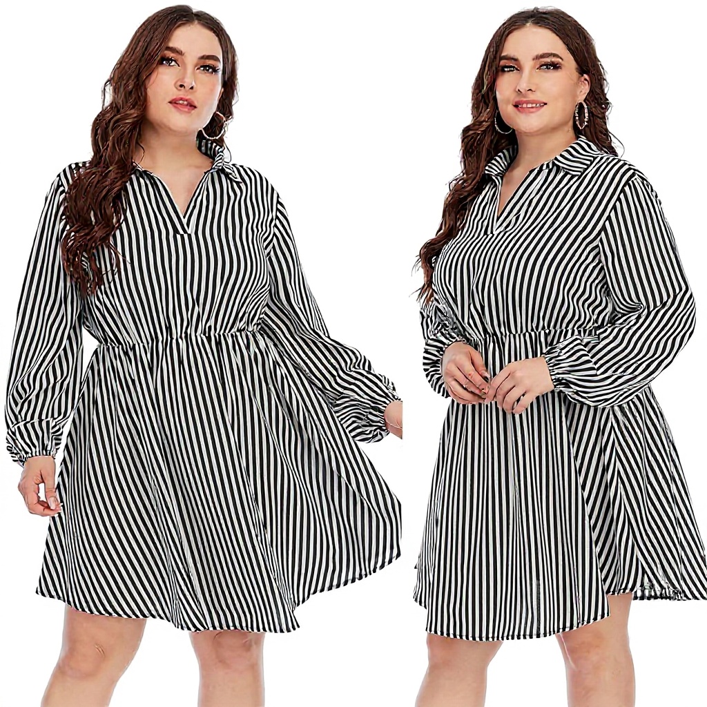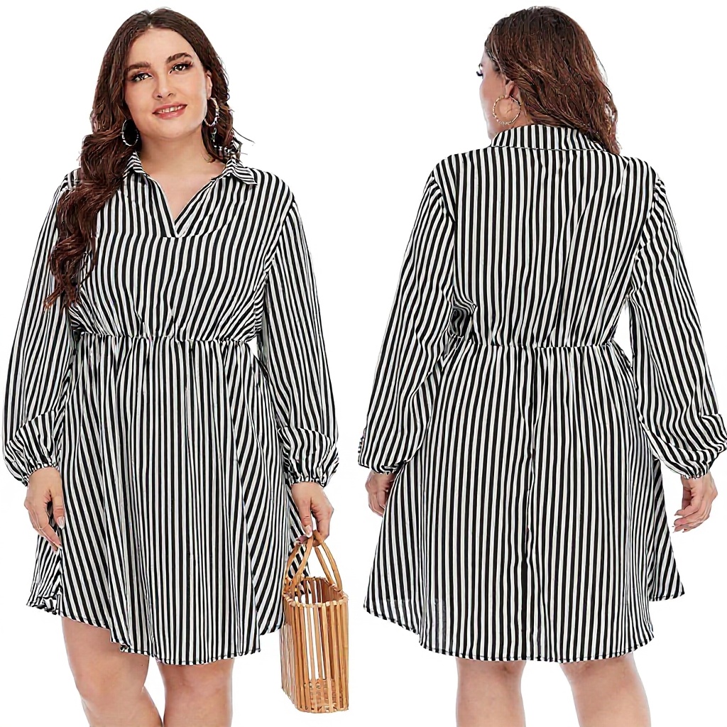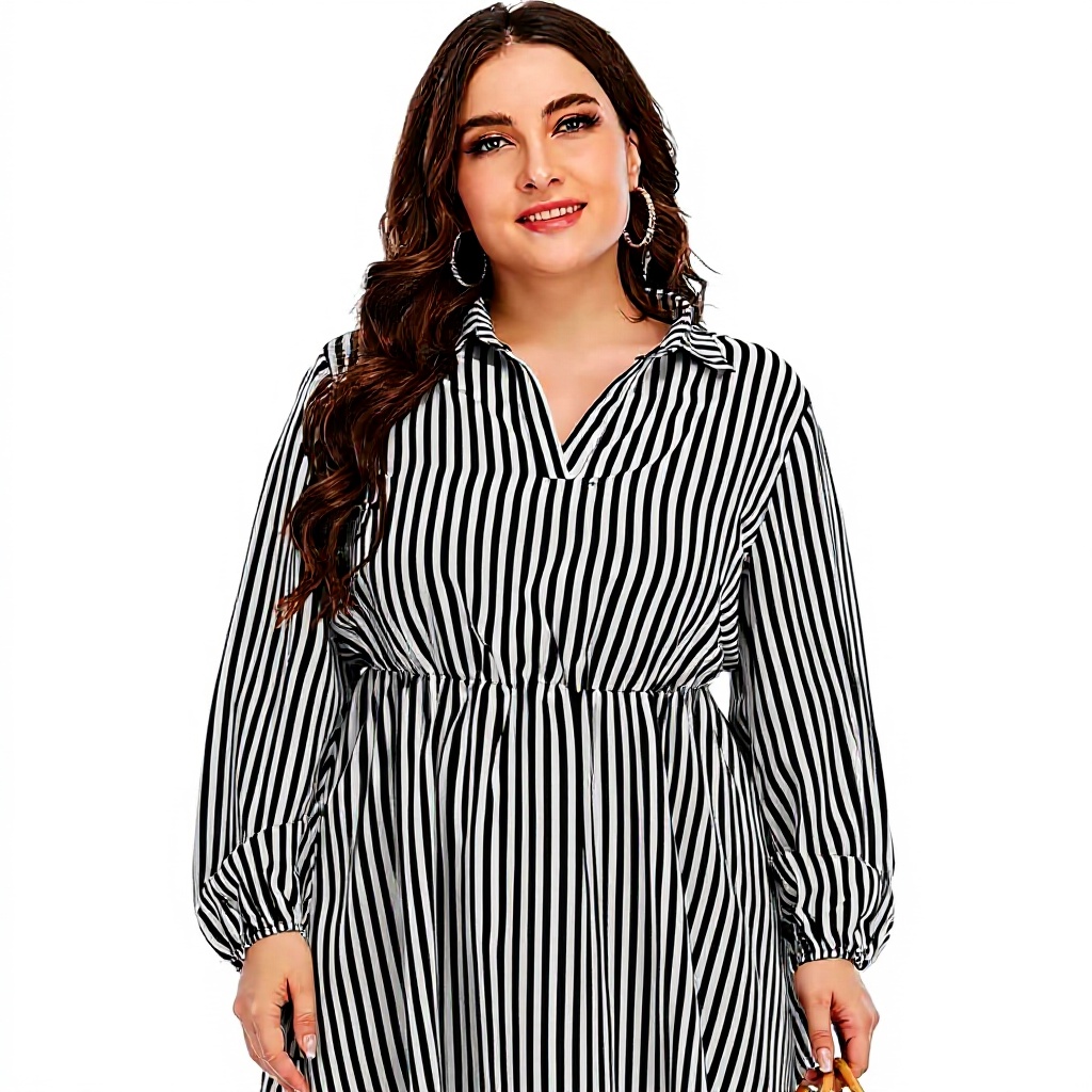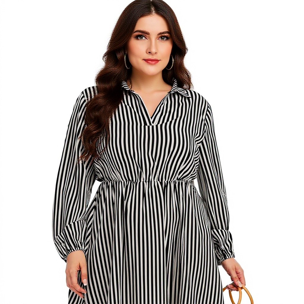 Questo abito elegante da donna presenta una stampa a righe moderna e un collo rovesciato, realizzato con tessuti confortevoli e traspiranti per garantire massima comodità. Il design a vita alta esalta la silhouette, rendendolo ideale per chi cerca un capo alla moda e funzionale.
