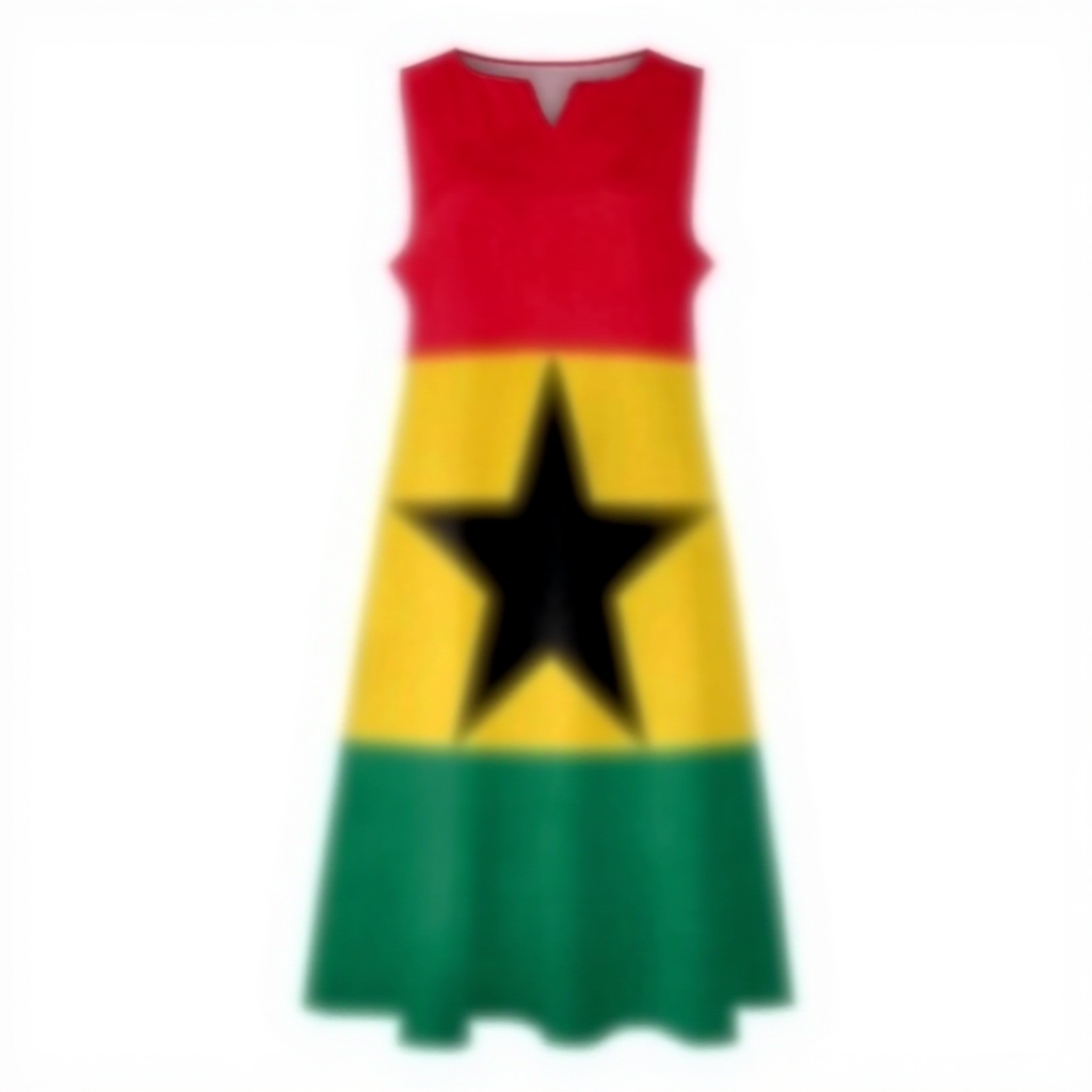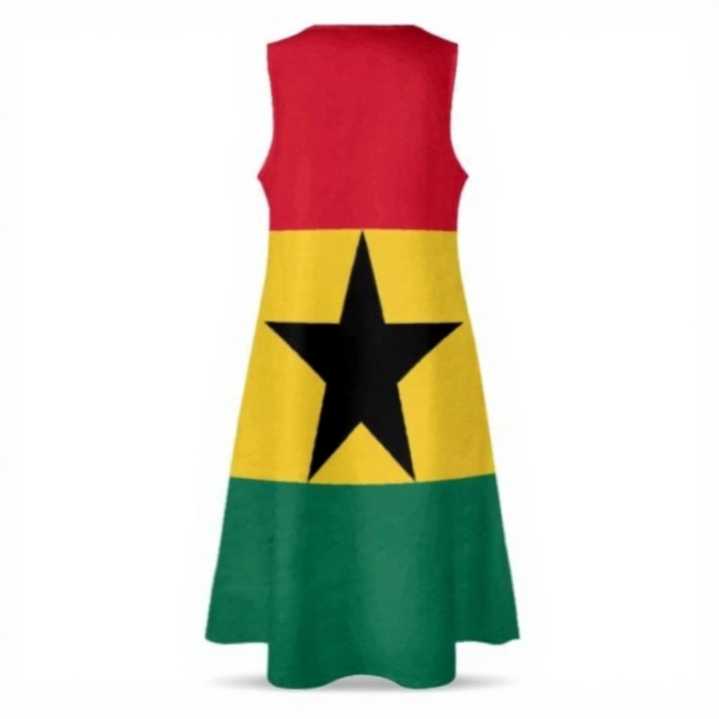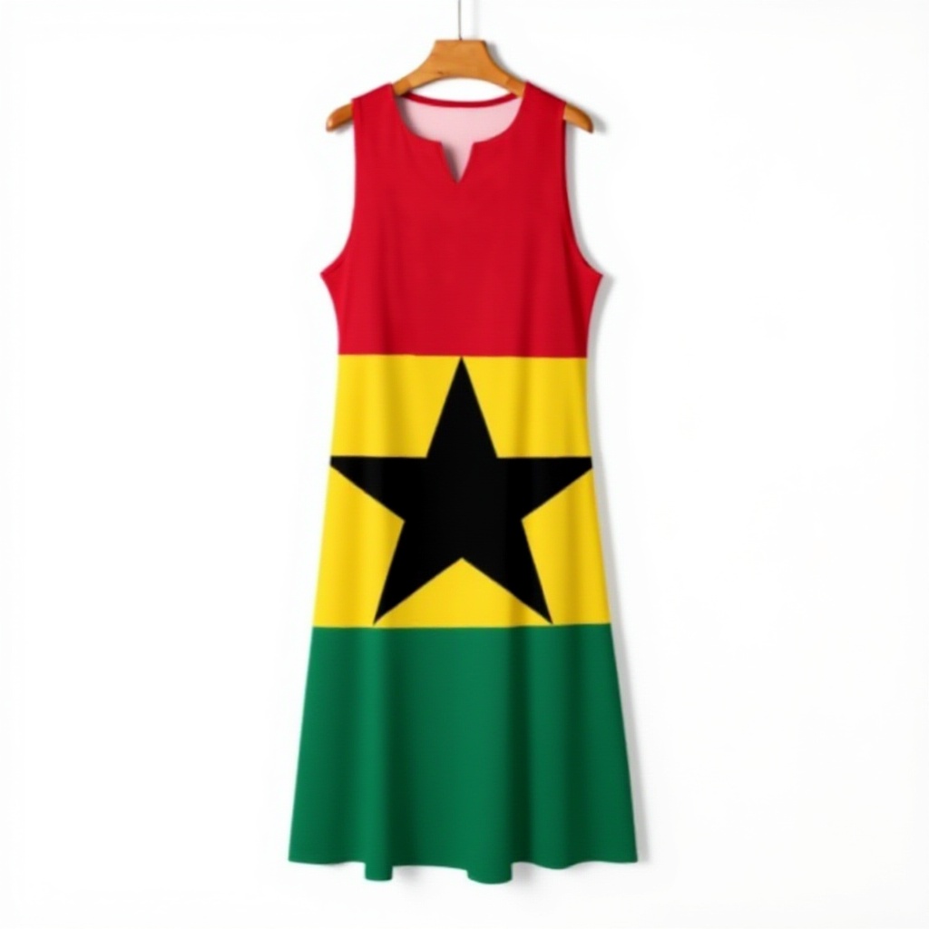 Questo abito lungo estivo senza maniche è realizzato in poliestere di alta qualità, che garantisce morbidezza, leggerezza e traspirabilità. Il design esclusivo presenta stampe digitali 3D vivaci della bandiera Ghana, con un taglio aderente in vita e una gonna fluida che si allunga fino alla caviglia, offrendo un look elegante e casual.