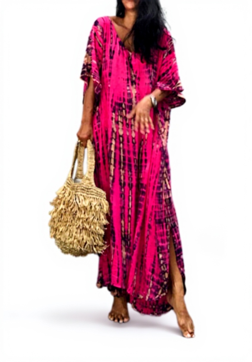 Il copricostume caftano unisce eleganza e praticità con un design boho chic, ideale per le donne che cercano stile al mare. Realizzato in tessuto leggero e traspirante, offre una vestibilità comoda e una lunghezza maxi di 138 cm, perfetta per coprire e valorizzare la silhouette. Disponibile nei colori rosa e giallo, è facile da indossare e adatto per diverse occasioni estive.