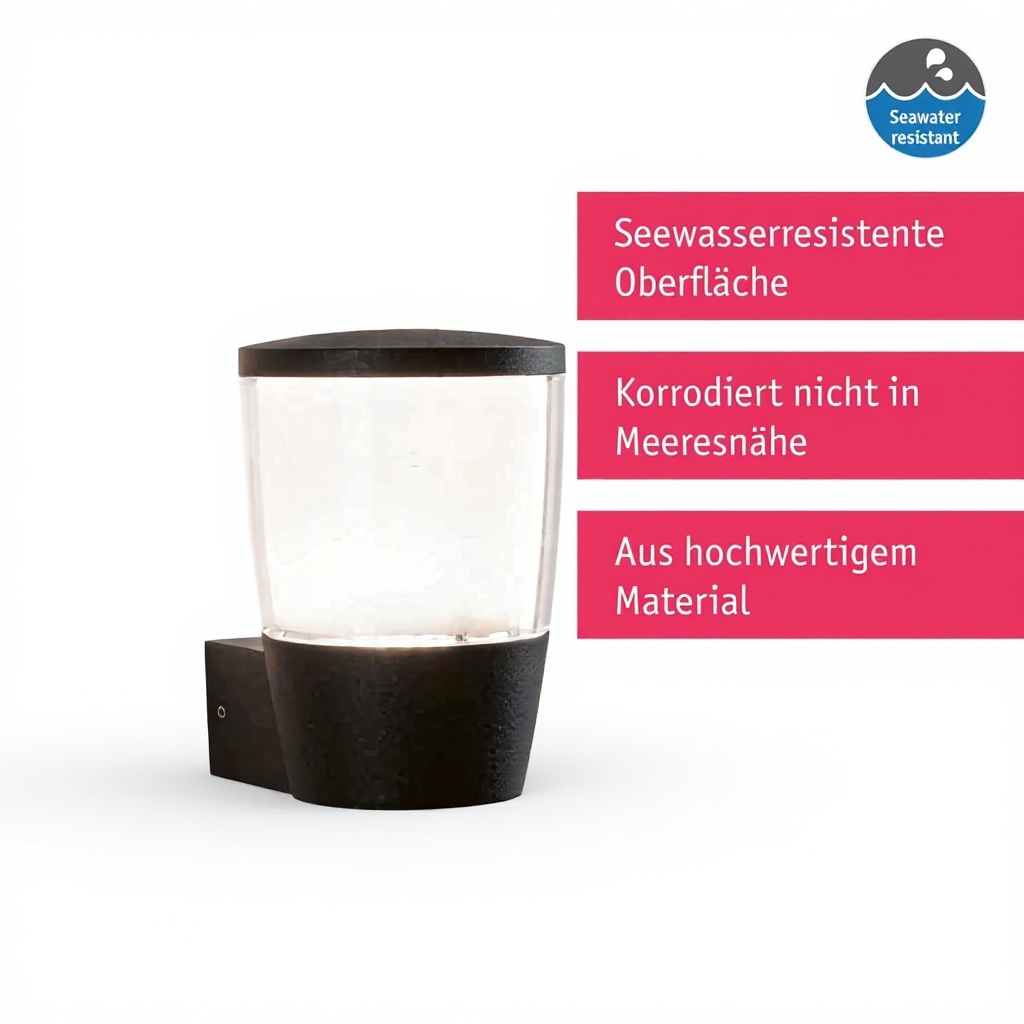 La lampada da parete Paulmann Bako unisce design moderno e robustezza per l’illuminazione esterna. Realizzata in alluminio con finitura antracite, offre una protezione IP44 contro i getti d’acqua diretti e resistenza specifica all’acqua di mare. Con un design compatto e lineare, si integra perfettamente in qualsiasi architettura esterna.