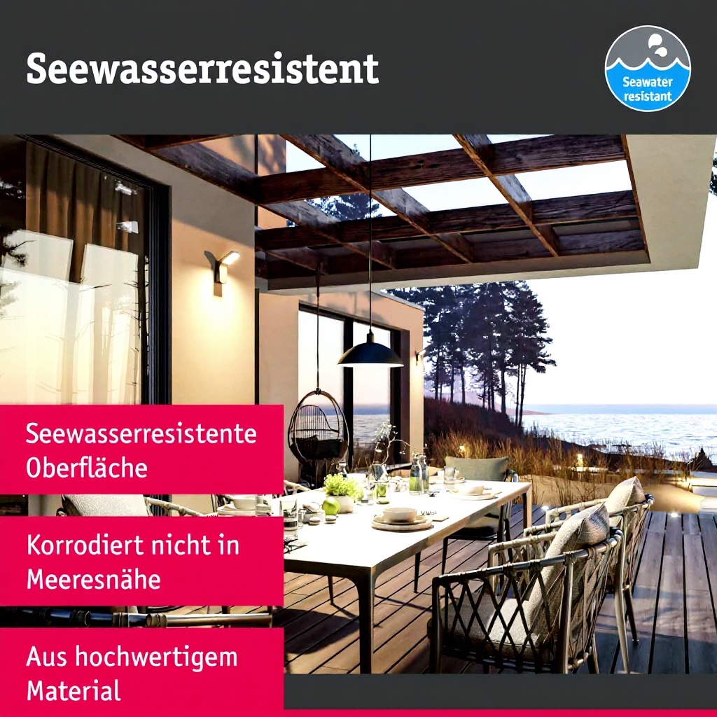 Sì, la lampada Paulmann Bako è specificamente progettata per resistere all’acqua di mare e all’aria salmastra, grazie alla sua costruzione in alluminio e alla protezione IP44.